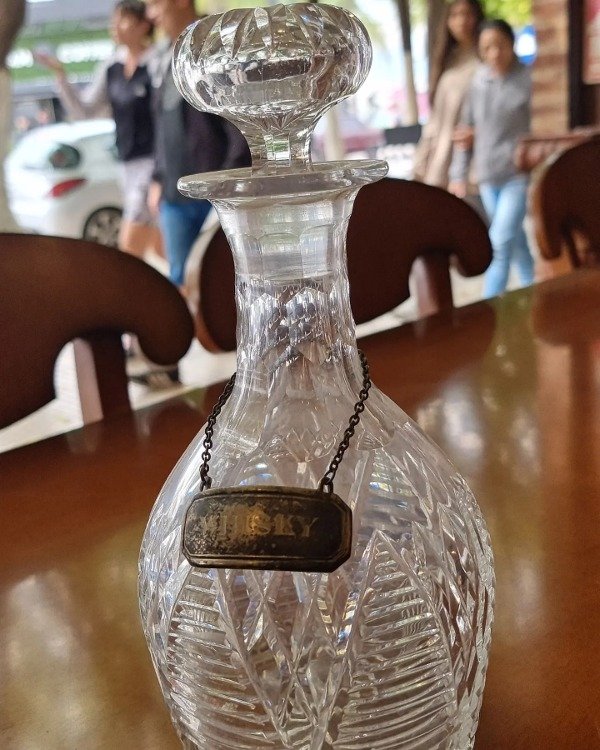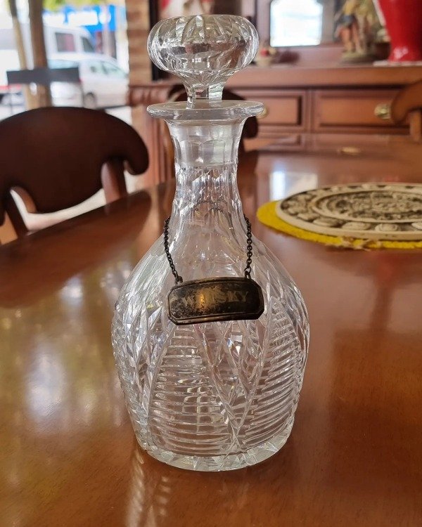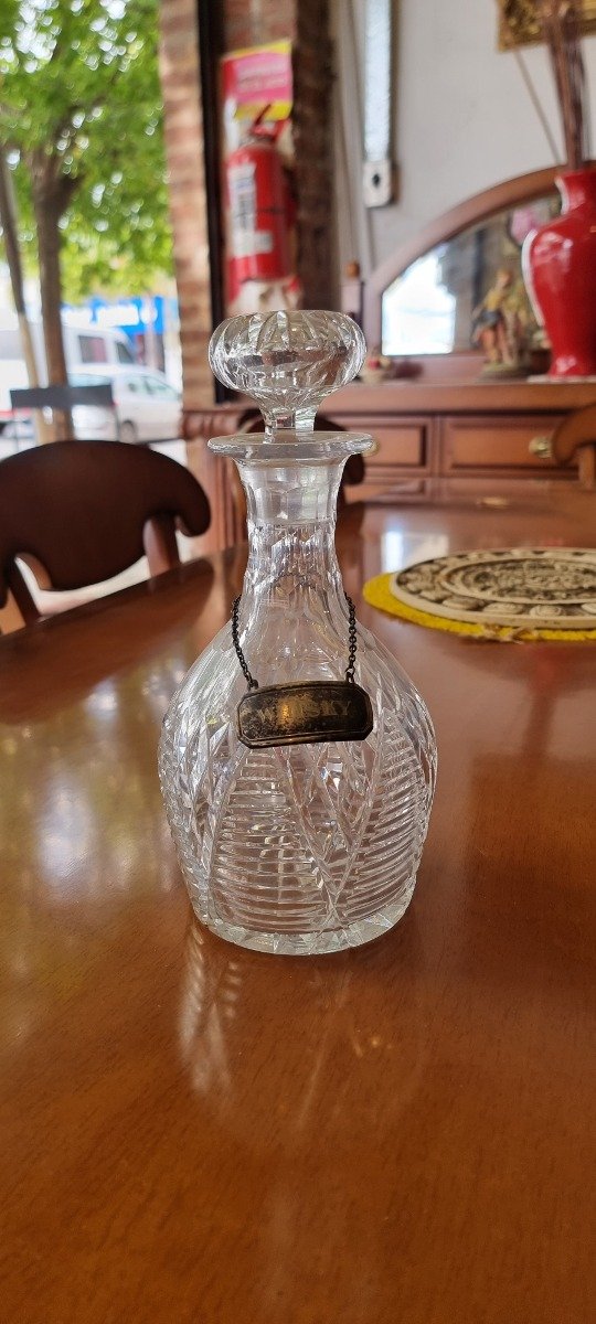 Excelente whiskera de cristal antigua, con chapa con cadena con la leyenda "Whisky".